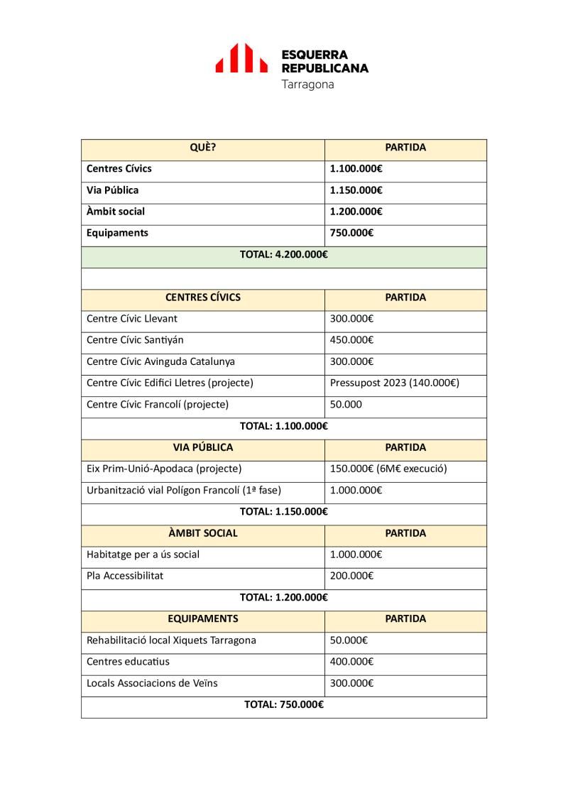 Otros compromisos conseguidos son la inversión de 400.000 euros en mantenimiento de las escuelas para mejorar sus condiciones, 300.000 euros para el mantenimiento y mejora de los locales de las asociaciones de vecinos y 200.000 más para redactar “un proyecto de accesibilidad completo y real”. Puig ha añadido que también hay una partida de 50.000 euros para la redacción del proyecto “de habilitar y acondicionar el edificio donde se encuentra la sede del ICAC, en la plaza de en Rovellat, como local casteller de los Xiquets de Tarragona y que a la vez también sería un local social que haría las funciones de centro cívico”.
