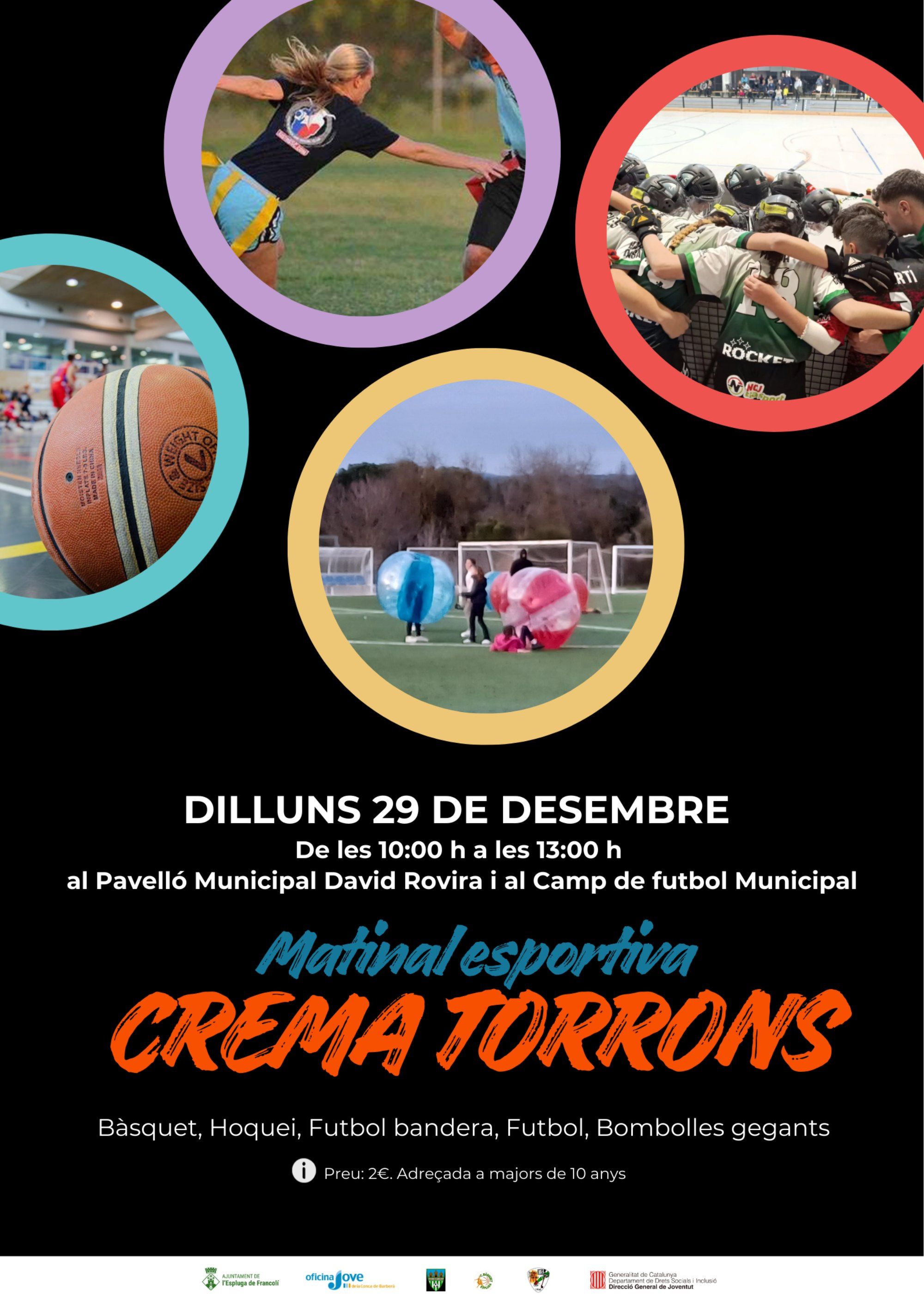 La Espluga de Francolí acogerá el próximo lunes 29 de diciembre la actividad Crema Torrons 2025, promovida por la Concejalía de Juventud del Ayuntamiento de La Espluga de Francolí, en colaboración con la Oficina Jove de la Conca de Barberà, el Hoquei Casal Espluga, el Club Bàsquet Espluga de Francolí, la Unió Esportiva l’Espluga, los Indians Flag Football y el colectivo Fem Pinya.