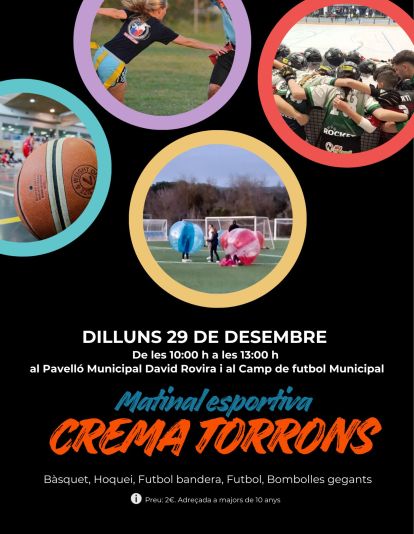 Las entidades locales se harán cargo de dinamizar y garantizar un ambiente festivo y saludable. El objetivo de Crema Torrons 2025 es fomentar la práctica deportiva, promover la colaboración entre entidades juveniles y deportivas, y ofrecer una jornada de diversión y deporte en comunidad.