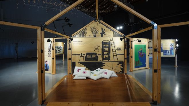 La exposición presenta una propuesta innovadora que sitúa la orientación como una habilidad esencial para gestionar transiciones vitales diversas. Utiliza la metáfora de una casa tridimensional abierta que despliega paneles configurando un laberinto con múltiples recorridos. Esta estructura busca desdibujar los límites entre interior-exterior o sujeto-mundo, evocando el proceso constante de adaptación personal en un entorno cambiante.