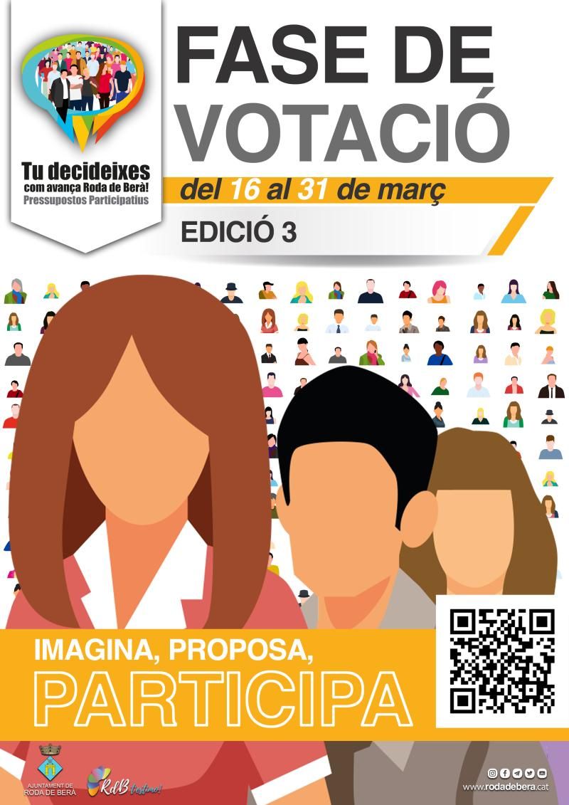 Los rodenses podrán elegir a partir del próximo jueves en qué propuestas se invertirán 130.000 euros del presupuesto municipal. La fase de votación de la edición 3 de los Presupuestos Participativos se alargará durante dos semanas, hasta el 31 de marzo. Durante este tiempo, las personas empadronadas, mayores de 16 años, podrán elegir un total de tres propuestas, una del ámbito general y dos de dos barrios diferentes, una para cada barrio.