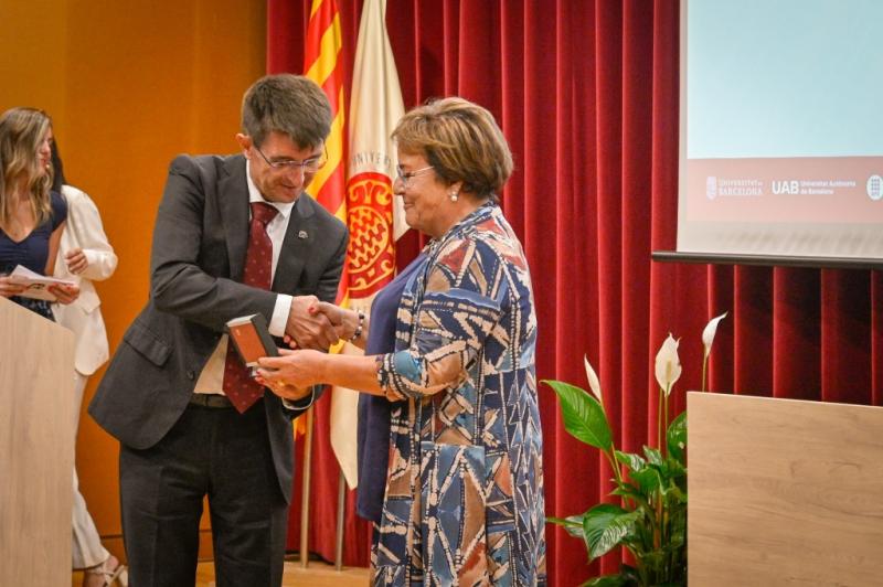 Durante el acto, Maria José Figueras Salvat, rectora de la URV de 2018 a 2022, ha recibido la Medalla de la Universidad. Ha agradecido “a la comunidad universitaria y el equipo que me dieron confianza para ser su rectora, en un período que no fue fácil, por la continuada falta de recursos, de plantilla, además de la pandemia. Pero PAS y PDI hicieron que saliéramos exitosos como institución.”