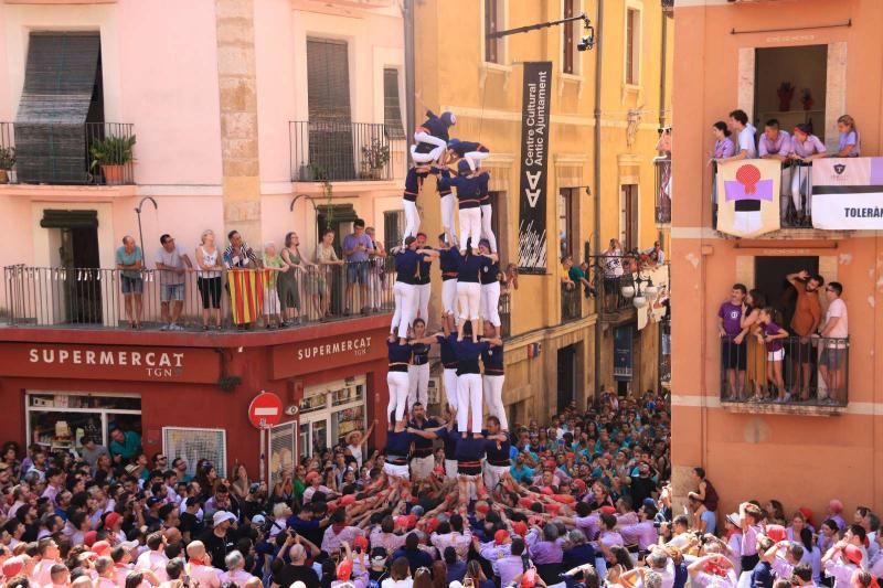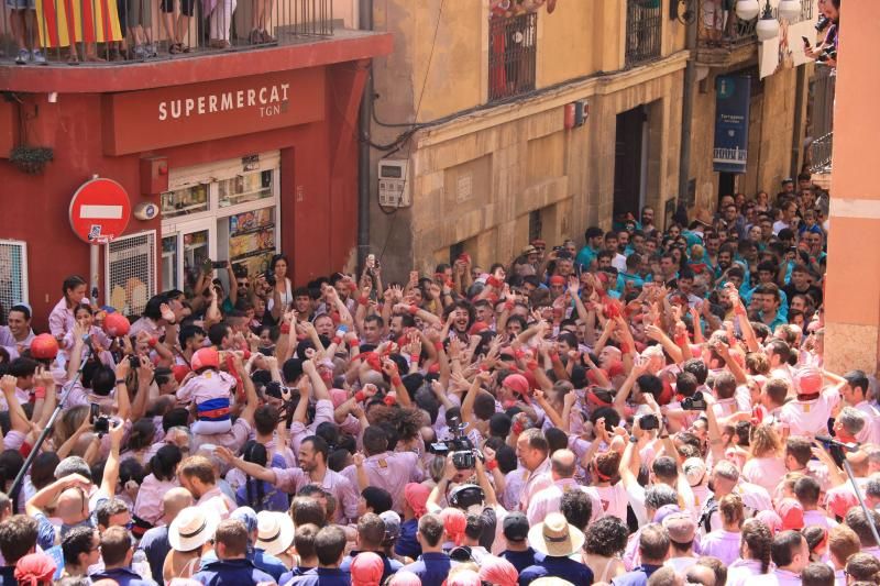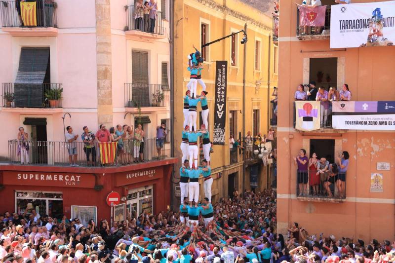 Puntuales a las doce del mediodía, tal y como marca el protocolo, la Colla Jove Xiquets de Tarragona ha abierto plaza con un 3 de 9 con forro descargado con calma y que ha recibido la ovación del numeroso público reunido en la plaza de les Cols y que ha resistido los más de treinta grados de una jornada soleada. Los abanicos, sombreros, gorras y aguas bien frescas no han faltado en la estampa que se ha vivido en las escaleras de la catedral durante la fiesta mayor pequeña de la ciudad.