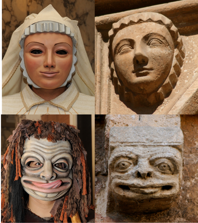 A la hora de encontrar el diseño de estas máscaras, el Esbart tenía claro que debía ser “una representación alegórica que tuviera cierto sentido”. De la Catedral de Tarragona sacaron los modelos de los pecados del siglo XII que están en el claustro y los de las virtudes del siglo XIV que se sitúan en la fachada. Las primeras máscaras fueron obra de Muntsa Plana, mientras que la segunda versión de 2012 fue a cargo de Àngels Cantos. Los cambios vinieron impulsados por el anhelo de mejorar y potenciar la presencia visual del baile y a la vez resolver algunos problemas técnicos que daban las anteriores.