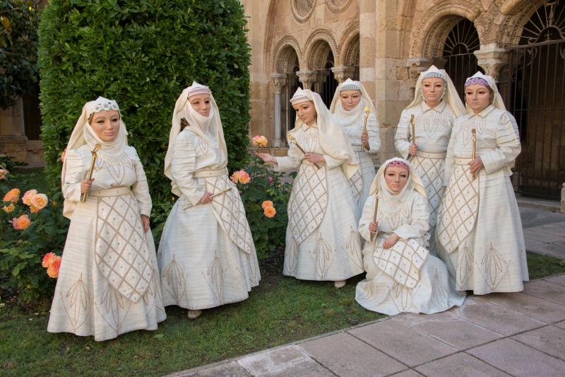 En el caso de los pecados, las máscaras van rematadas con una imitación de cabellos que tienen el color del pecado que representan (verde de la envidia, rojo de la ira...). En cambio, el de las virtudes son con un pañuelo que lleva bordado una de las diferentes Armas Christi, que la iglesia ha utilizado para establecer el combate espiritual con los pecados. Unos diseños que se extrajeron de imágenes grabadas en la Catedral. Además, los dibujos de los vestidos de cuerpo y los bastones también tienen sus referencias en la misma Catedral.