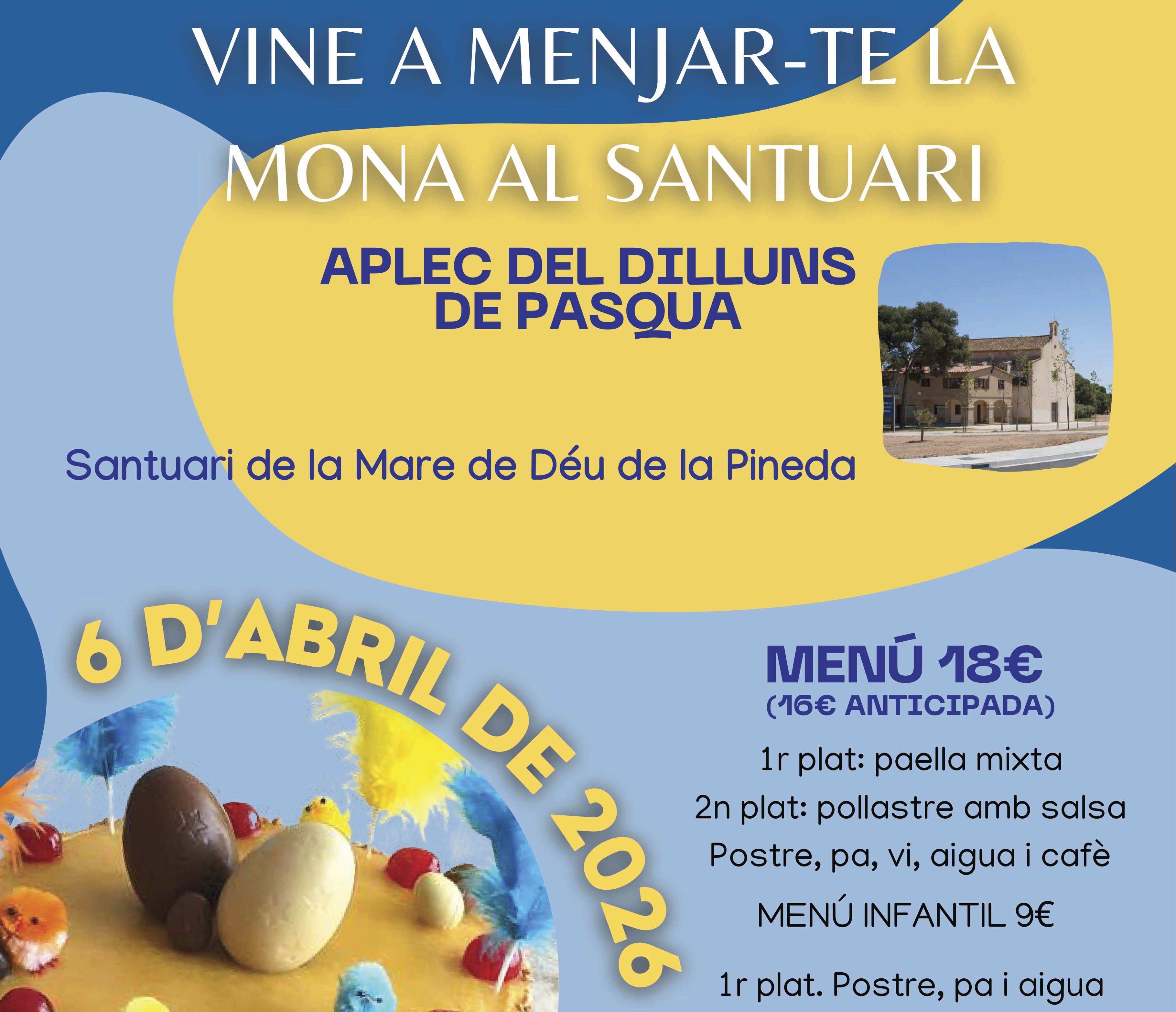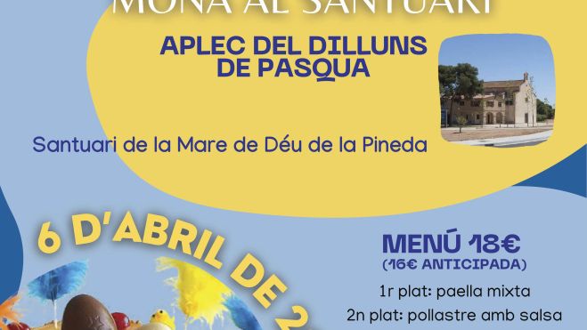 Además del Aplec, y como ya es tradición, para todo el que quiera seguir disfrutando de la festividad del Lunes de Pascua y comerse la tradicional mona, el Club Fútbol Vila-seca organiza una comida en el mismo Santuario de la Madre de Dios de la Pineda.