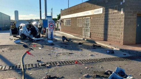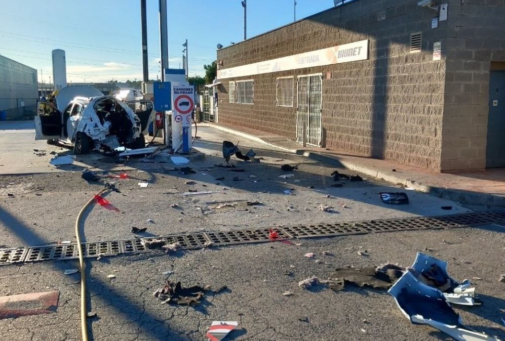 Este mediodía, alrededor de las 15:39 horas, dos personas han resultado heridas después de que un vehículo explotara por completo mientras repostaba gasolina en una gasolinera de la calle del Coure, en el polígono Riu Clar. Los Bomberos de la Generalitat han recibido la alerta en cuestión de minutos y al llegar se han encontrado con el vehículo completamente destrozado y los dos heridos aún en la zona afectada.