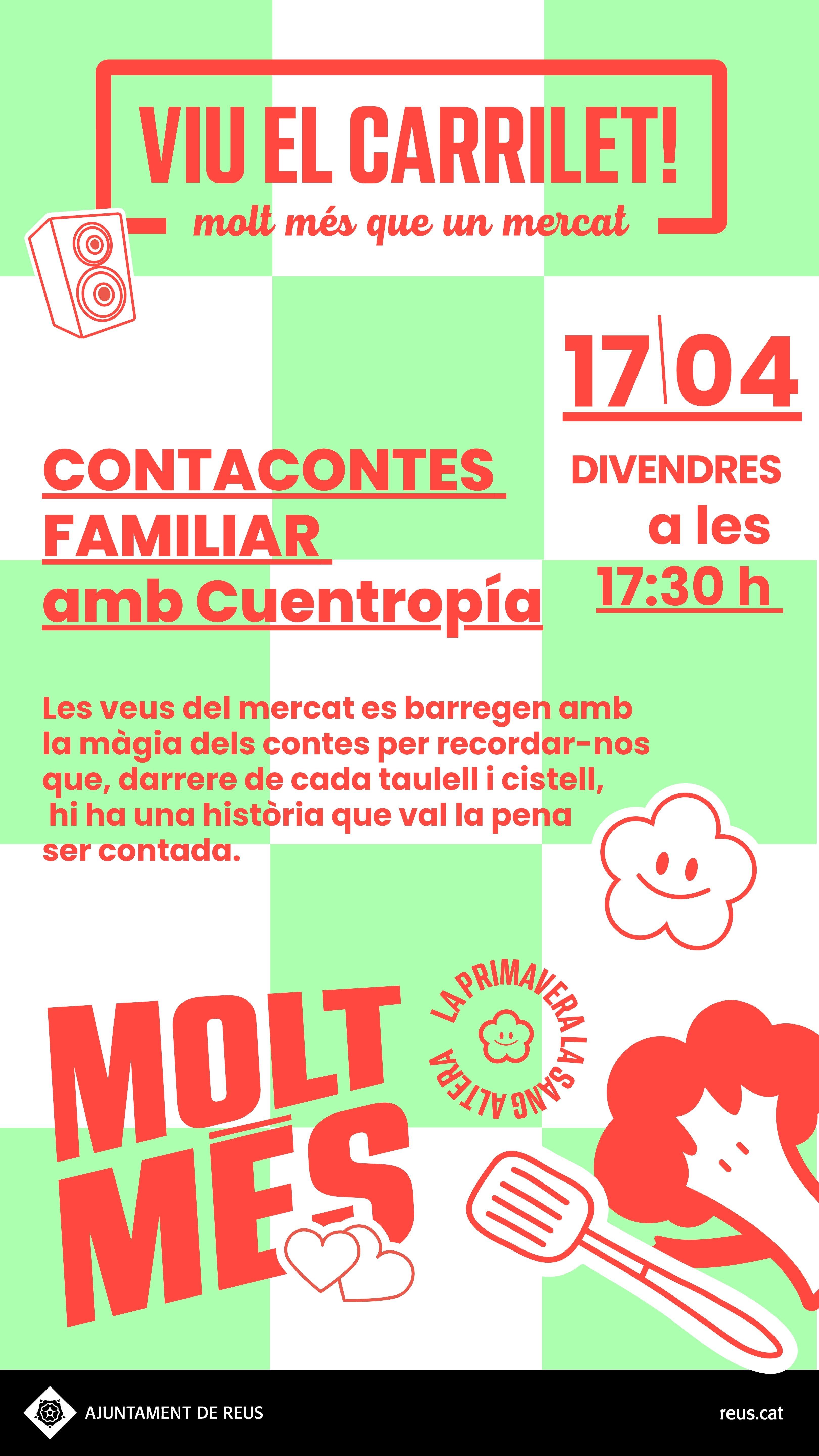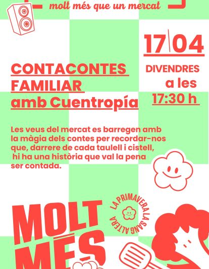 A las 17:30 h, la entidad Cuentropía ofrecerá una sesión destinada a público familiar titulada "Cuentos entre puestos y oficios". Esta propuesta invita a adentrarse en un recorrido sonoro por los puestos tradicionales del mercado, donde “entre el saco de legumbres y el cuchillo de la carnicera” se descubre que “cada oficio es un mundo”.