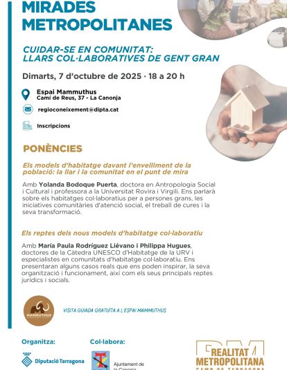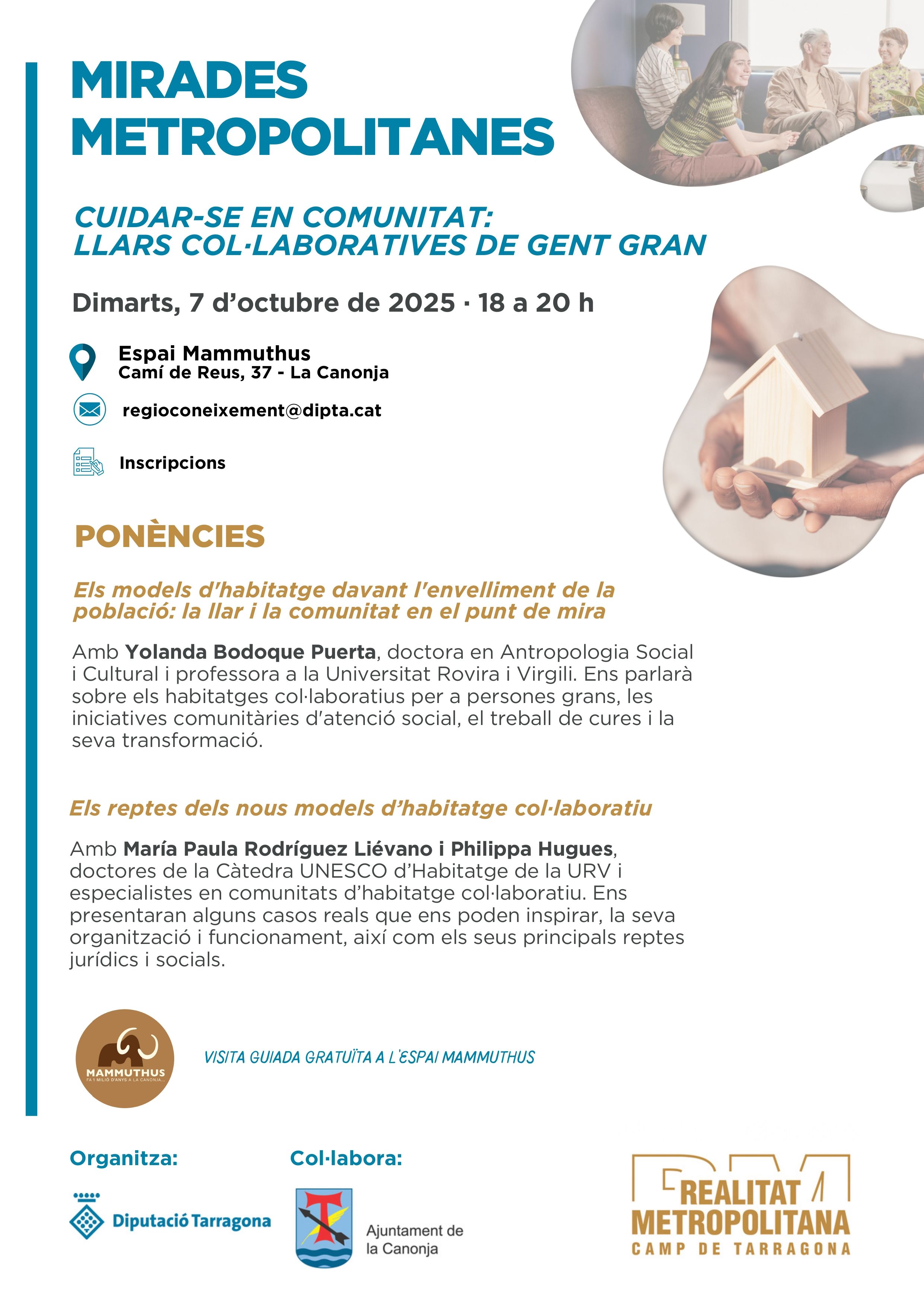 La Diputación de Tarragona retoma el ciclo “Miradas Metropolitanas” el martes 7 de octubre, con una sesión centrada en el envejecimiento y los nuevos modelos residenciales para las personas mayores. El encuentro, titulado “Cuidarse en comunidad: hogares colaborativos de personas mayores”, tendrá lugar en el Espai Mammuthus de la Canonja, a partir de las 18 h.