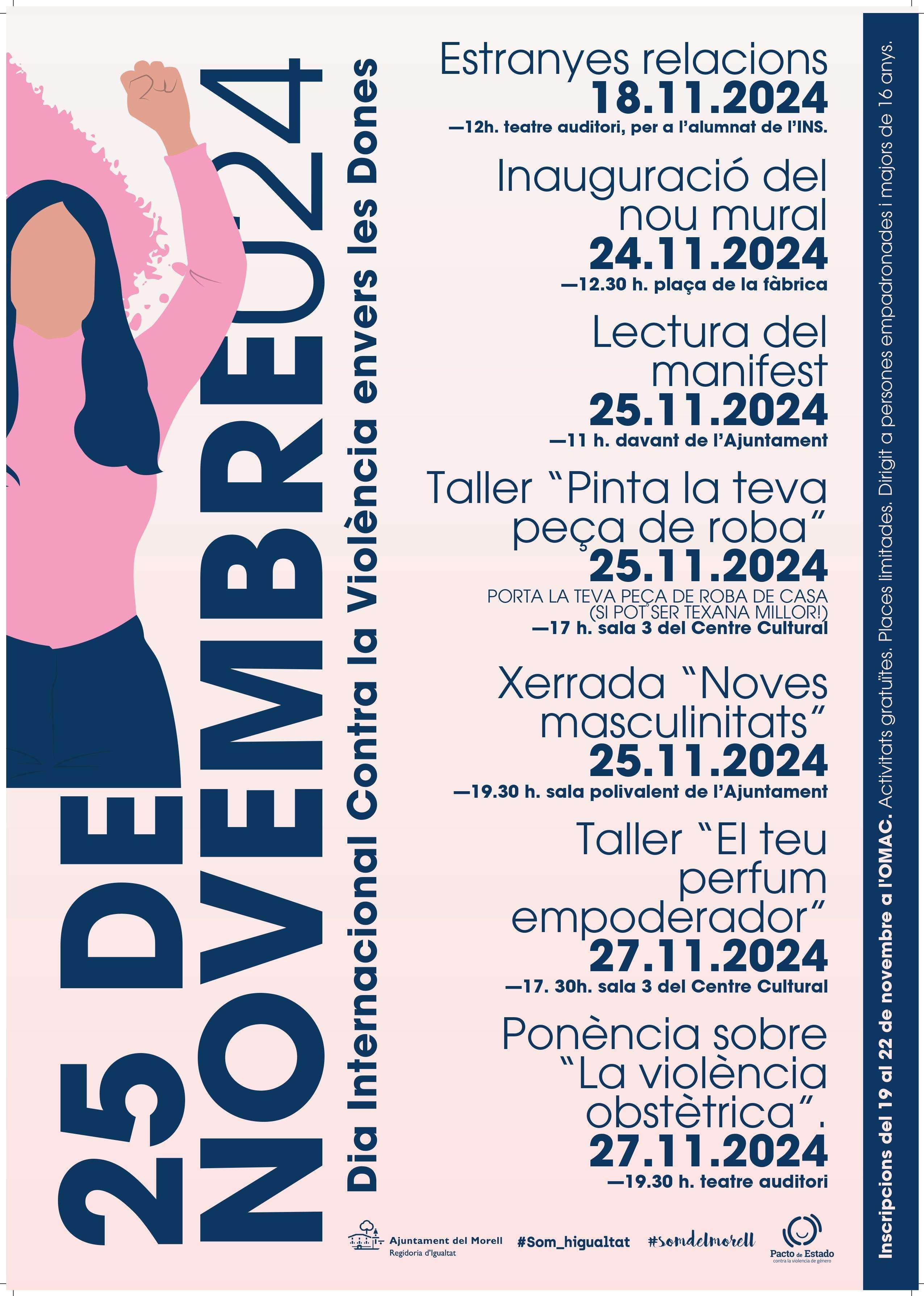El programa se ha iniciado el 18 de noviembre a las 12 h con la representación de la obra "Extrañas relaciones" en el Teatro Auditorio, dirigida al alumnado del Instituto de El Morell. El 24 de noviembre a las 12.30 horas se inaugurará el nuevo mural conmemorativo de las trabajadoras de la antigua Fábrica, un acto que se realizará en la plaza de la Fábrica y que incluirá un vermut para todas las personas asistentes.