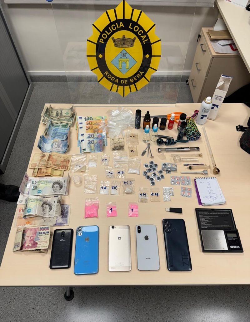 En el examen del vehículo, la Policía Local encontró una gran cantidad de sustancias estupefacientes, como ketamina, metanfetamina, marihuana y cristal, así como dinero en efectivo, diferentes teléfonos móviles, una báscula de precisión y diversos envoltorios de plástico.