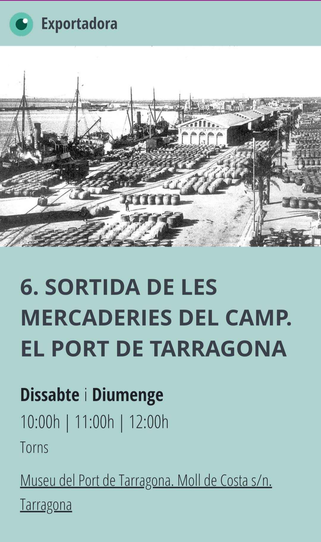 Este año, concretamente el próximo fin de semana, 5 y 6 de octubre de 2024, se podrán visitar diez espacios y se organizan cuatro rutas temáticas, de entre las cuales una tendrá lugar a lo largo del Muelle de Costa del Puerto de Tarragona para dar a conocer la importancia comercial que tuvo el puerto, donde se daba salida a los productos,tanto de Reus, como del interior de las comarcas y pueblos de El Camp de Tarragona.