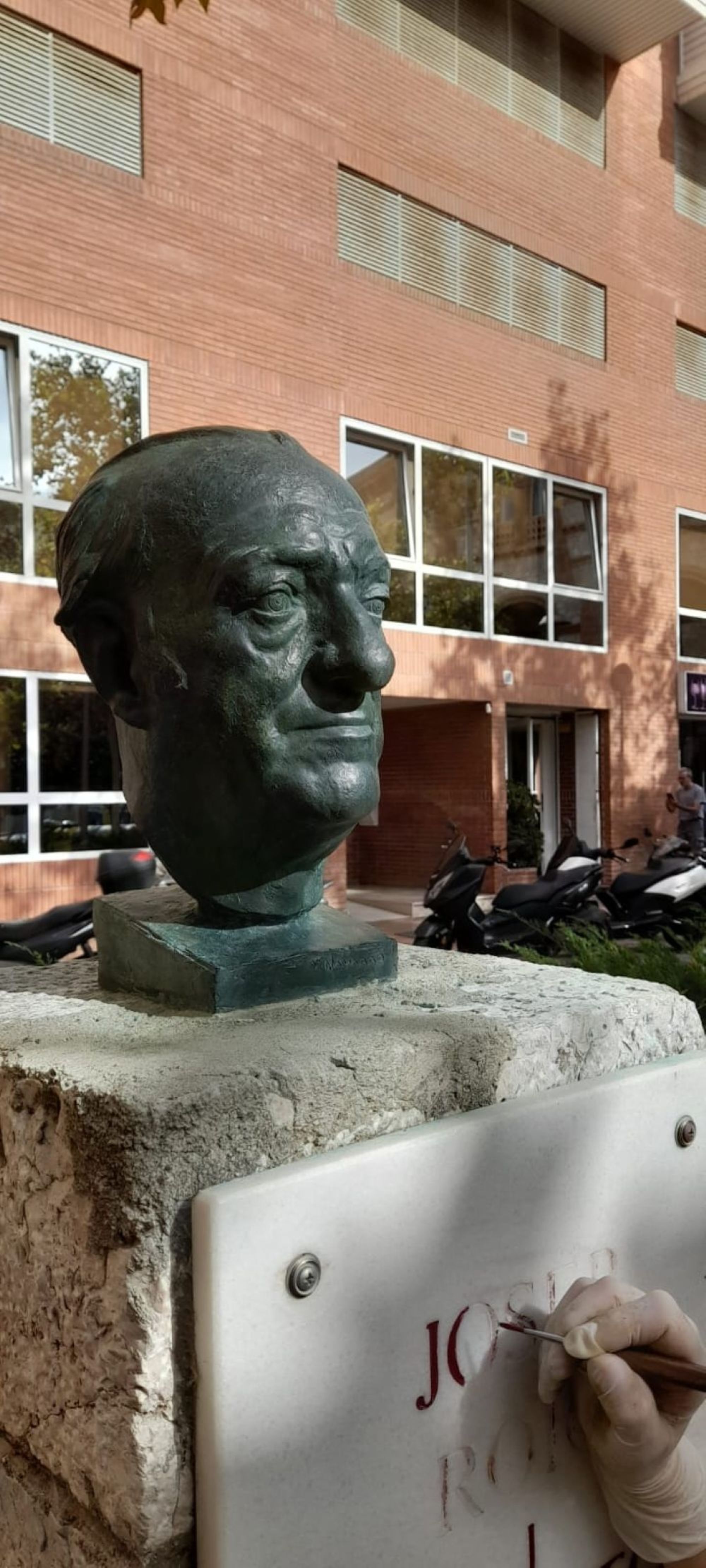 Las tareas han consistido en eliminar los restos de vandalismo y grafitis, limpiar manualmente toda la superficie y recuperar la pátina original del bronce con óxidos naturales. Además, se ha repintado el interior de las letras de la placa de mármol que acompaña a la escultura, con el fin de mejorar su legibilidad y conservación.