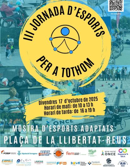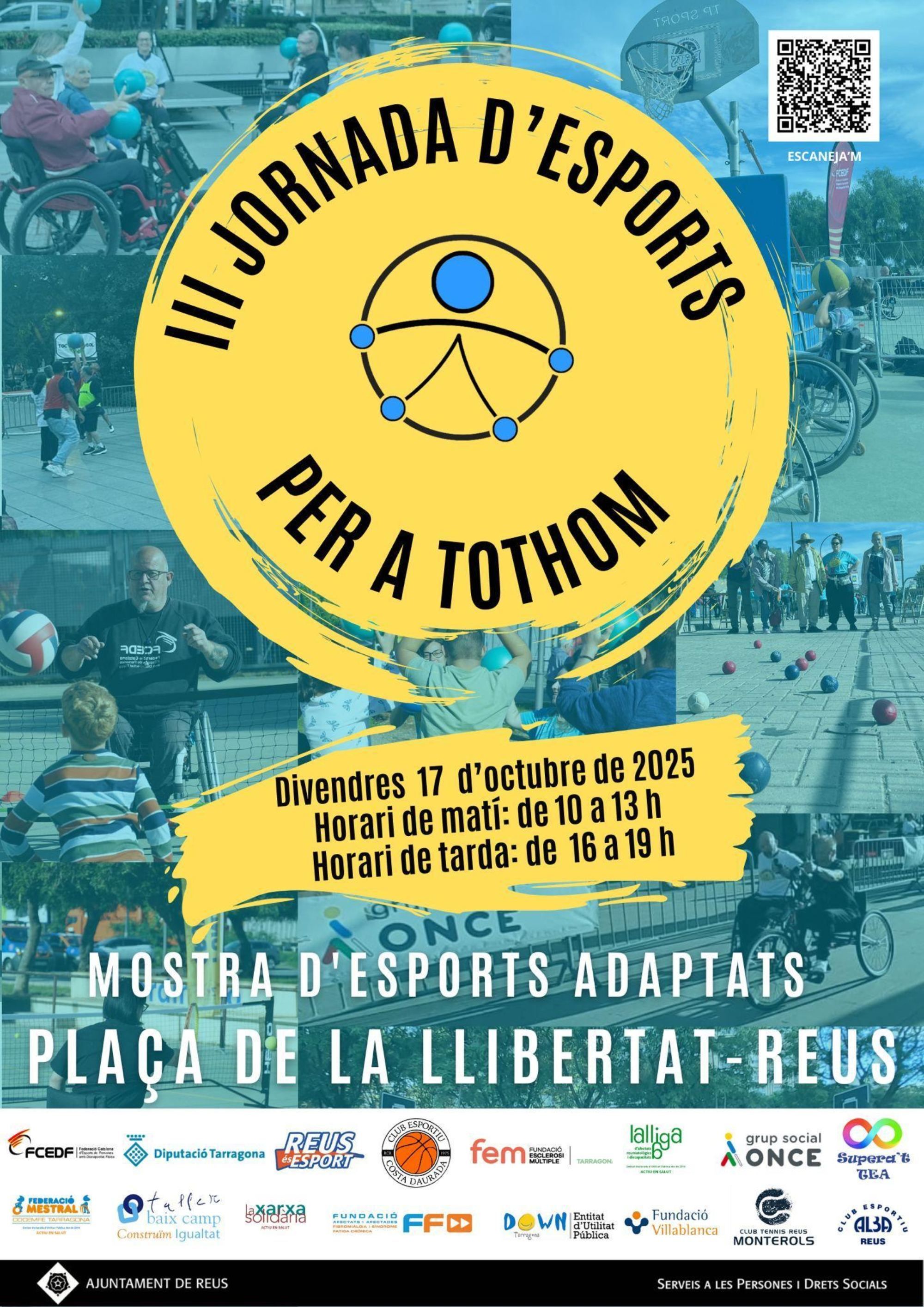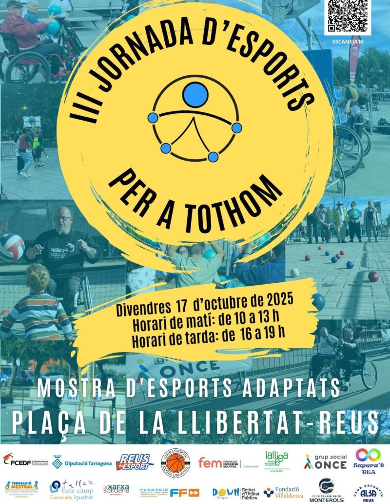 El viernes 17 de octubre, la ciudad de Reus será el escenario de la III Jornada de Deportes para Todos, una propuesta inclusiva que convertirá la plaza de la Llibertat en un espacio de experimentación, convivencia y práctica deportiva adaptada. La actividad se desarrollará en horario de mañana (10 a 13 h), dirigida a centros escolares, y en horario de tarde (16 a 19 h), abierta a toda la ciudadanía.