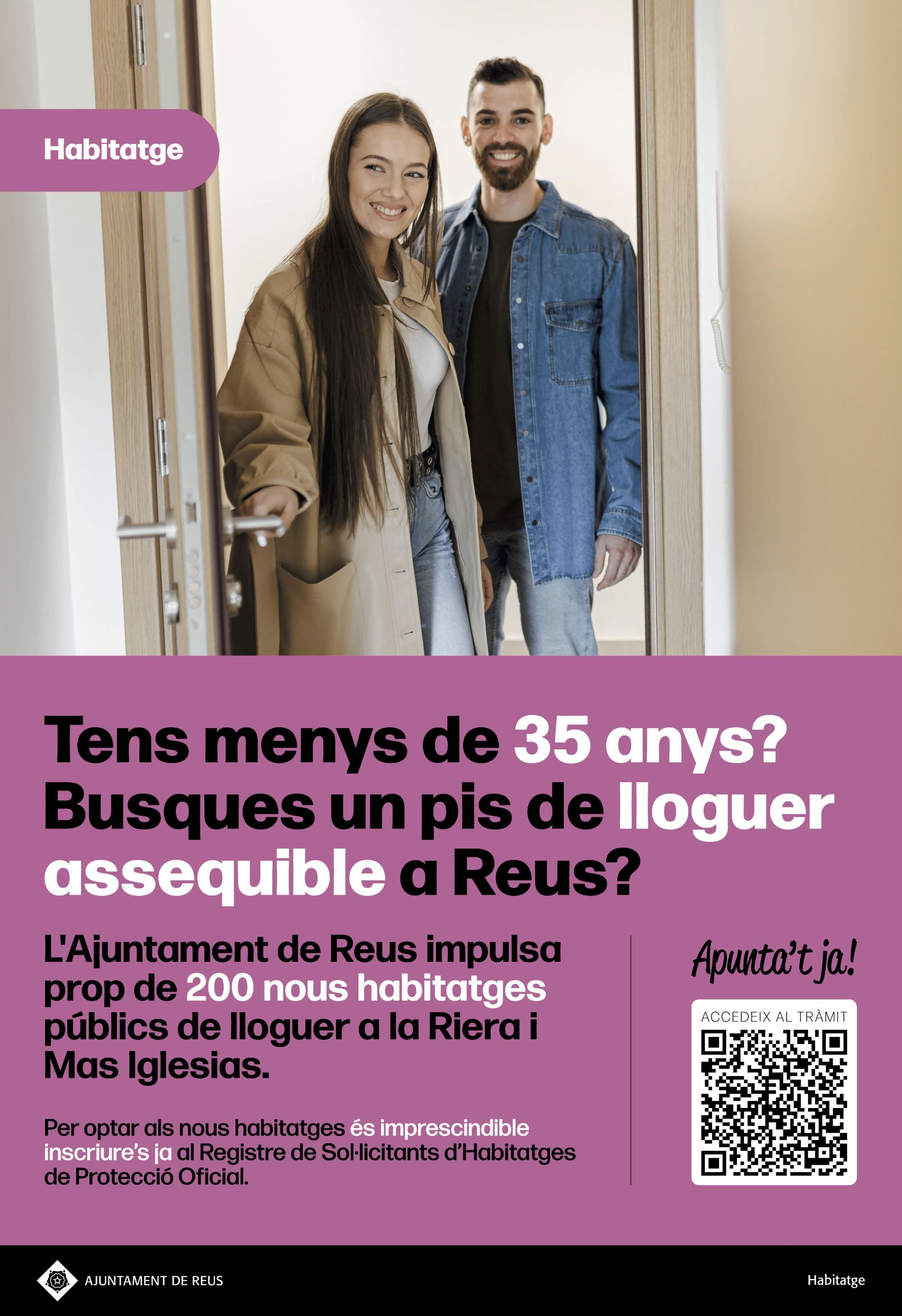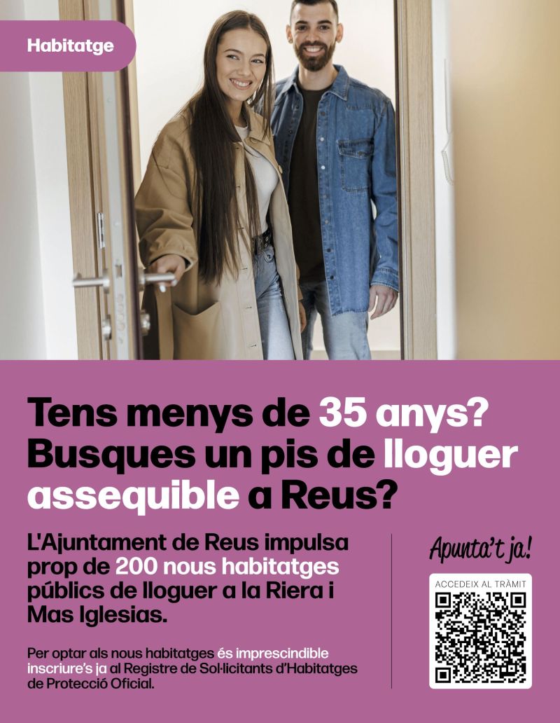 El Ayuntamiento de Reus ha puesto en marcha una campaña informativa dirigida a las personas jóvenes de menos de 35 años para incentivar su inscripción en el Registro de Solicitantes de Vivienda con Protección Oficial de Cataluña (RSHPO). La iniciativa quiere asegurar que este colectivo pueda optar a las viviendas de alquiler público de las nuevas promociones de Mas Iglesias y la Riera, que suman 180 pisos y reservarán el 35% de las unidades para jóvenes.