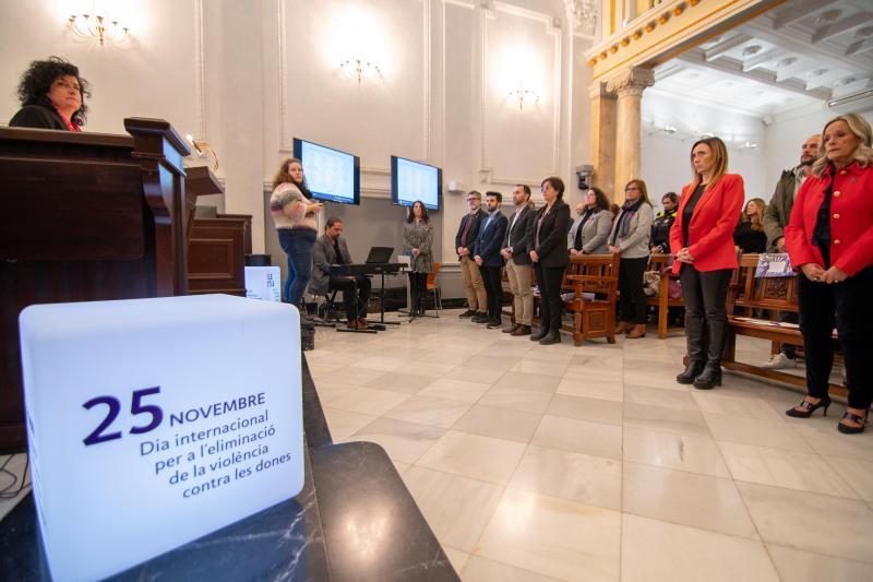 La alcaldesa de Reus, Sandra Guaita Esteruelas, y la concejala del Área de Servicios a las Personas y Derechos Sociales del Ayuntamiento de Reus, Anabel Martínez Serrano, han presidido este viernes, 24 de noviembre, el acto institucional con motivo del Día Internacional para la Eliminación de la Violencia hacia las Mujeres.