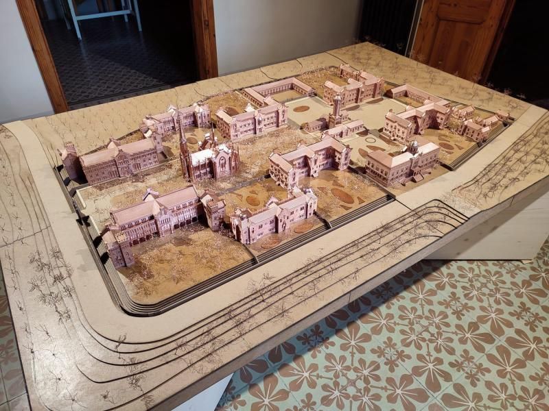 La maqueta del Pere Mata muestra al visitante cómo el arquitecto Domènech i Montaner imaginó el complejo. Esta, se ha hecho a partir de la documentación histórica conservada y sobre todo a partir de una imagen aérea que hizo el arquitecto para mostrar el conjunto. Se han ido completando los detalles de la obra gracias al conocimiento de los edificios construidos. Esta información ha permitido dibujar todo el complejo en soporte informático consiguiendo un modelo completo.