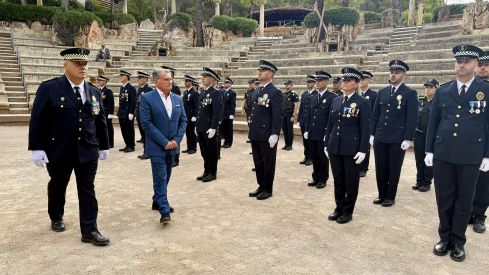 La cita se ha iniciado pasados las diez y media, con la formación de toda la plantilla en el anfiteatro del resort, donde el alcalde Pere Virgili y el subinspector jefe, Antonio Gómez, han pasado revista.