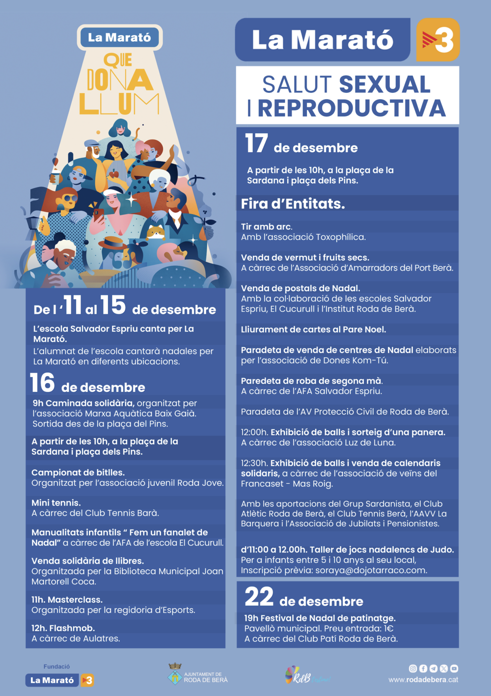 Roda de Berà se suma un año más a La Marató y ha organizado un amplio programa de actividades para recaudar fondos para destinarlos, en esta ocasión, a la investigación en el ámbito de la salud sexual y reproductiva.