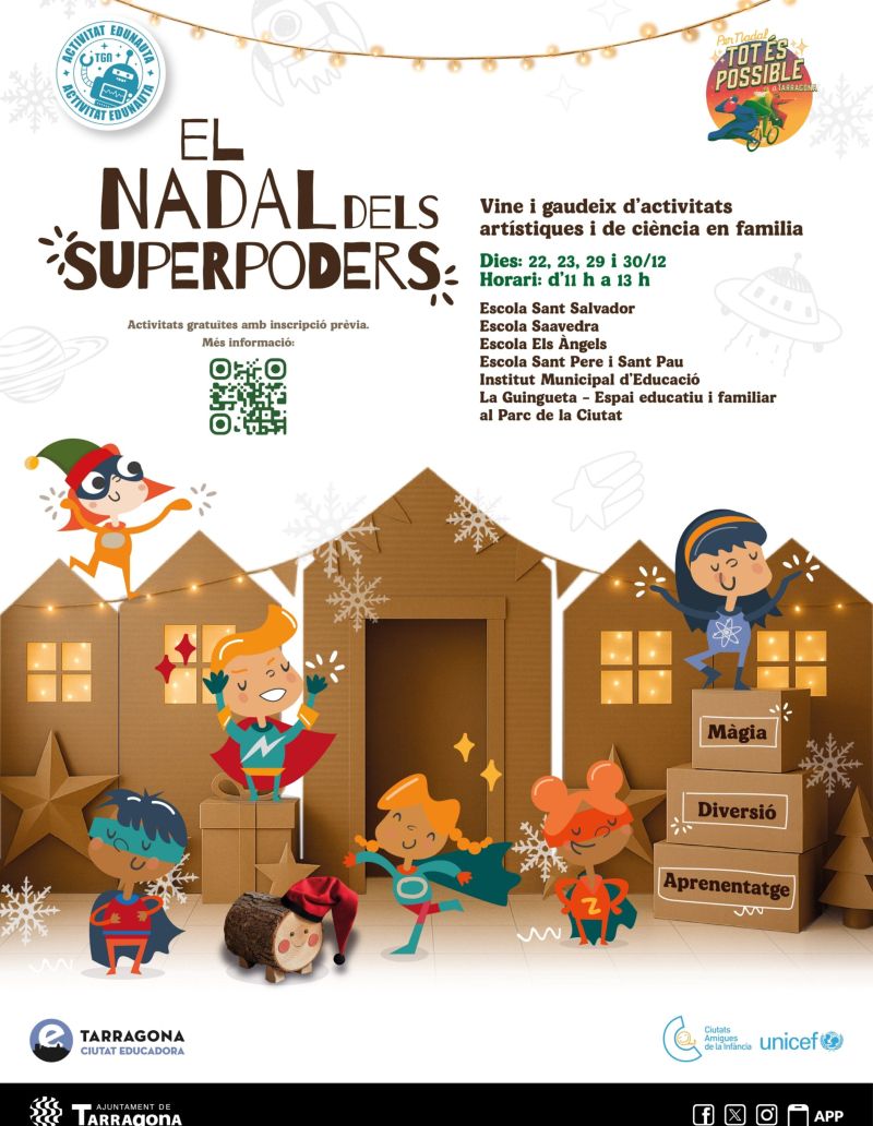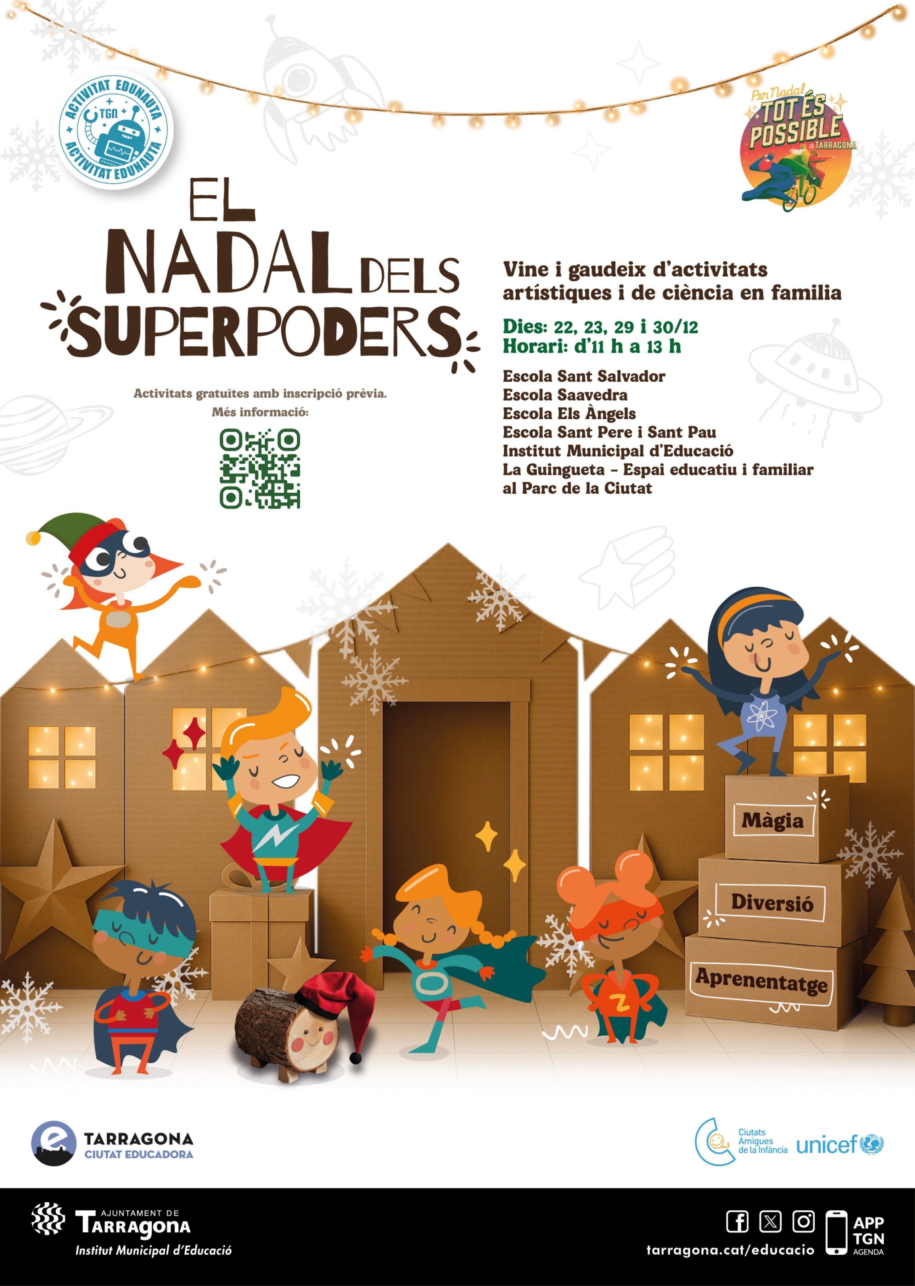 El Instituto Municipal de Educación de Tarragona ofrece este año El Nadal dels Superpoders, 24 actividades familiares para disfrutar aprendiendo durante las fiestas de Navidad, en diferentes espacios de la ciudad: 4 centros educativos (Escola Sant Salvador, Escola Saavedra, Escola Els Àngels y Escola Sant Pere i Sant Pau), Parc de la Ciutat e Instituto Municipal de Educación.