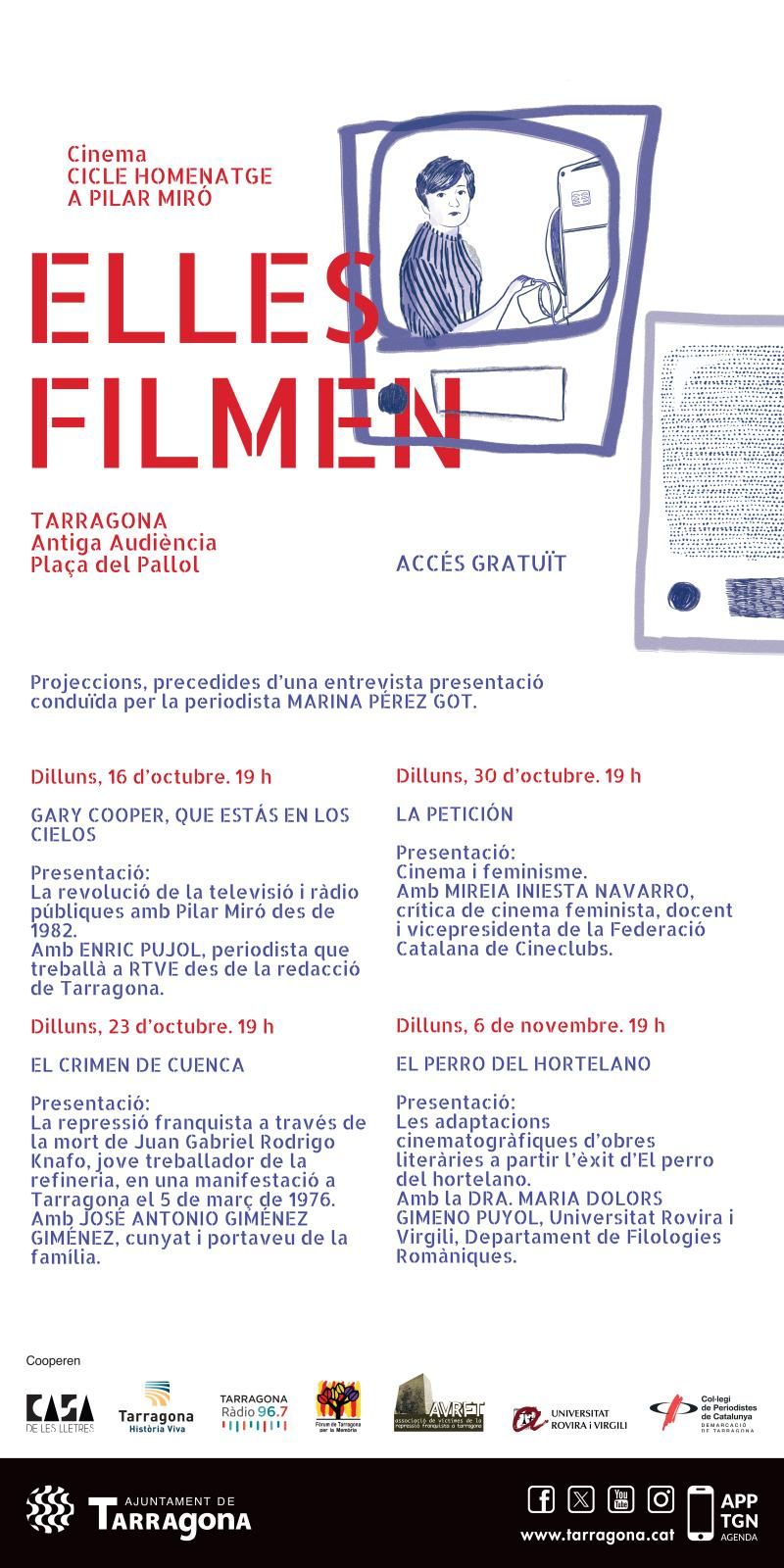 La Antigua Audiencia acogerá un nuevo ciclo de cine con vocación de perspectiva de género, con el título Ellas Filman, dedicado en su primera edición a la directora y periodista Pilar Miró. El ciclo se ha presentado hoy en rueda de prensa por la consejera de Cultura de Tarragona, Sandra Ramos, acompañada de la diseñadora de la imagen gráfica Marina Barberá Domingo. Esta nueva iniciativa consta de cuatro actividades, que tendrán lugar cada lunes del 16 de octubre al 6 de noviembre a las 19 h con acceso gratuito a la sala de actos de la Antigua Audiencia.