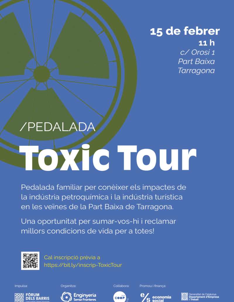Con el objetivo de mostrar cómo la apuesta por ciertas actividades económicas en la ciudad conllevan perjuicios para la salud de las personas, la Comunalidad Urbana de Tarragona – Foro de los Barrios, de la mano de Ingeniería Sin Fronteras, organiza la actividad Toxic Tour, una pedalada ciudadana por la Parte Baja de la ciudad con el objetivo de dar a conocer diversas luchas por la justicia ambiental. La actividad es una oportunidad para conocer de cerca estas problemáticas y las propuestas de la sociedad civil para transformar la realidad del territorio.