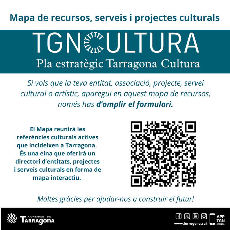 En este momento, desde Tarragona Cultura se hace un llamamiento para que las entidades y asociaciones tarraconenses que quieran aparecer en este mapa de recursos culturales con su proyecto, servicio cultural o artístico, rellenen el formulario necesario a través del portal participa.tarragona.cat