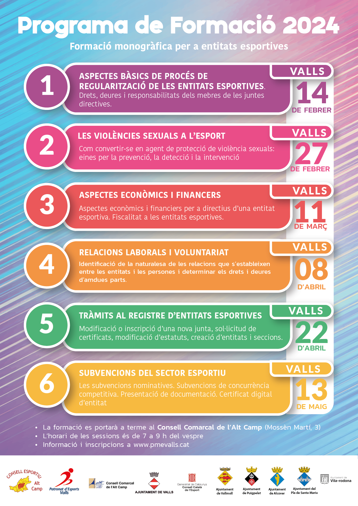 El Patronato Municipal de Deportes de Valls, el Consejo Deportivo de L'Alt Camp y los Ayuntamientos de Vallmoll, Sanaüja, Alcover, El Pla de Santa Maria y Vilarodona, ofrecen a los clubes deportivos del municipio y la comarca un plan de formación gratuito, dirigido principalmente a los equipos directivos y gestores deportivos de cada entidad.Este programa de formación consiste en 6 sesiones cortas y monográficas de un par horas de duración para tratar temas de interés que afectan directamente a las entidades.