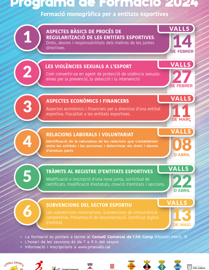 Así, la sesión inaugural tendrá lugar el 14 de febrero en Valls y se hablarán aspectos básicos de proceso de regularización de las entidades deportivas. Y también de los derechos, deberes y responsabilidades de los miembros de las juntas directivas. En cuanto al resto de jornadas que se desarrollarán son: Las violencias sexuales en el deporte (26 de febrero), Aspectos económicos y financieros (11 de marzo) Relaciones laborales y voluntariado (8 de abril ), Trámites en el registro de entidades deportivas (22 de abril ), Subvenciones del sector deportivo (13 de mayo). Las sesiones tendrán lugar de 19 a 21 horas y se llevarán a cabo en el Consejo Comarcal de L'Alt Camp.