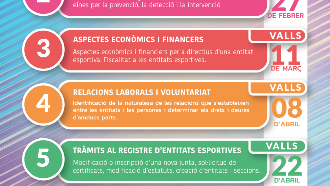 Así, la sesión inaugural tendrá lugar el 14 de febrero en Valls y se hablarán aspectos básicos de proceso de regularización de las entidades deportivas. Y también de los derechos, deberes y responsabilidades de los miembros de las juntas directivas. En cuanto al resto de jornadas que se desarrollarán son: Las violencias sexuales en el deporte (26 de febrero), Aspectos económicos y financieros (11 de marzo) Relaciones laborales y voluntariado (8 de abril ), Trámites en el registro de entidades deportivas (22 de abril ), Subvenciones del sector deportivo (13 de mayo). Las sesiones tendrán lugar de 19 a 21 horas y se llevarán a cabo en el Consejo Comarcal de L'Alt Camp.