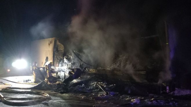 Controlado el incendio de un camión en el kilómetro 274 de la Ap-7 en Mont-roig del Camp (aviso 04.33h @112). Ha quemado parcialmente el remolque que transportaba palets de plástico y hemos evitado que el fuego se propagara a la tractora. No constan heridos.