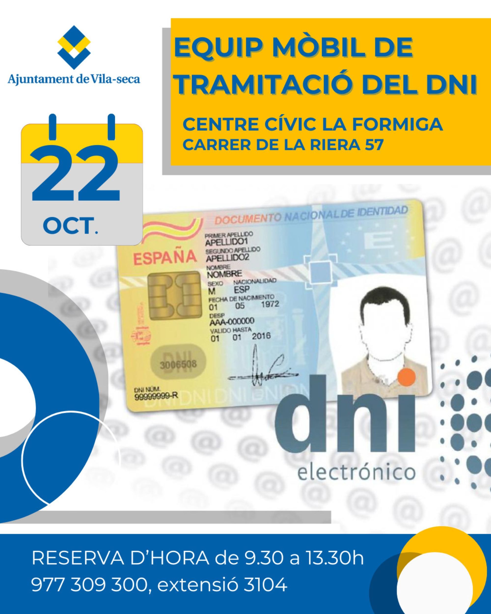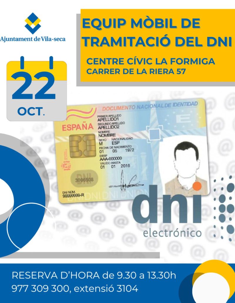 Los vecinos y vecinas de Vila-seca podrán renovar el DNI y el pasaporte sin necesidad de desplazarse fuera del municipio el miércoles 22 de octubre. La Comisaría Provincial de Tarragona ha confirmado la visita de un equipo móvil de tramitación que se instalará en el Centro Cívico La Formiga (calle de la Riera, 57), en horario de 9.30 a 13.30 h.