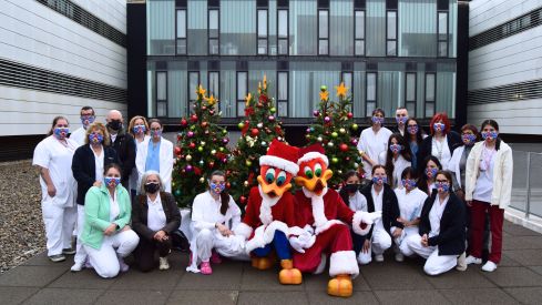 Para que los más pequeños pudieran participar de la visita respetando las medidas de seguridad establecidas por el incremento de infecciones respiratorias, Woody y Winnie han accedido al patio interior donde dan las ventanas de las habitaciones del área de pediatría. Este patio está decorado con motivos navideños cedidos por la Fundación Port Aventura, que un año más ha querido colaborar con el Hospital para poder acercar la magia de Navidad a los más pequeños.
