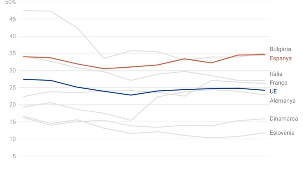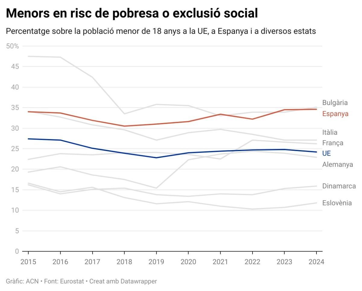El 24,2% dels infants de la UE, 19,5 milions de persones, estaven en risc de pobresa o exclusió social l’any 2024, segons dades d’Eurostat publicades aquest dimecres. La xifra suposa una disminució d’una mica més de mig punt respecte de 2023. En canvi, a l’Estat espanyol l’indicador repunta lleugerament el darrer any i el país es manté com el segon de la UE amb els valors més alts, amb un 34,6% de menors en aquesta situació, just per darrere de Bulgària, que supera el 35%. A l’altre extrem, països com Eslovènia (11,8%), Xipre (14,8%) i República Txeca (15,4%) són els que presenten els índexs més baixos l’any passat. Pel conjunt de la població, un 21% dels europeus estan en aquesta situació, i a Espanya el 25,8%.