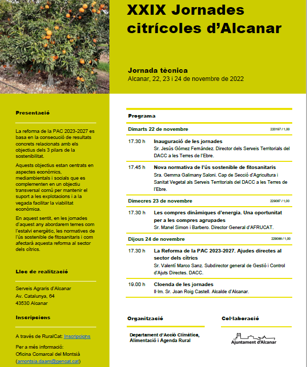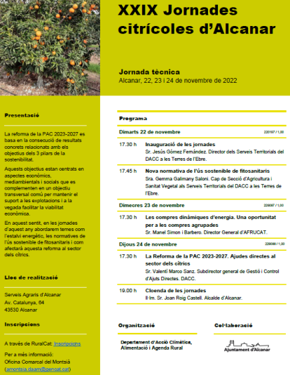 Un any més, el Departament d'Agricultura, Ramaderia, Pesca i Alimentació de la Generalitat de Catalunya, amb la col·laboració de l'Ajuntament d'Alcanar, organitza les Jornades Citrícoles d'Alcanar, un referent en el món de la citricultura, que arriben a la vint-i-novena edició.