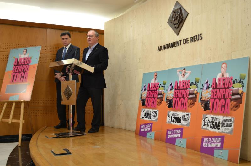 L’alcalde de Reus, Carles Pellicer, acompanyat del regidor de Seguretat, Joaquim Enrech, ha presentat aquest dimarts, 12 de febrer la campanya “A Reus sempre toca”, amb la qual el Govern de Reus reitera el seu compromís de “tolerància zero” contra l’incivisme. “Si te la jugues... Si te la jugues a ser un incívic... A Reus sempre toca! Et tocarà pagar una sanció contundent i exemplar. Hem posat en marxa la nova campanya, per recordar als incívics que no ens trem ola el pols —amb mesures contundents— contra aquells que s’obstinen en pertorbar la convivència dels reusencs. Amb el civisme, tots hi guanyem”, ha afirmat l’alcalde.