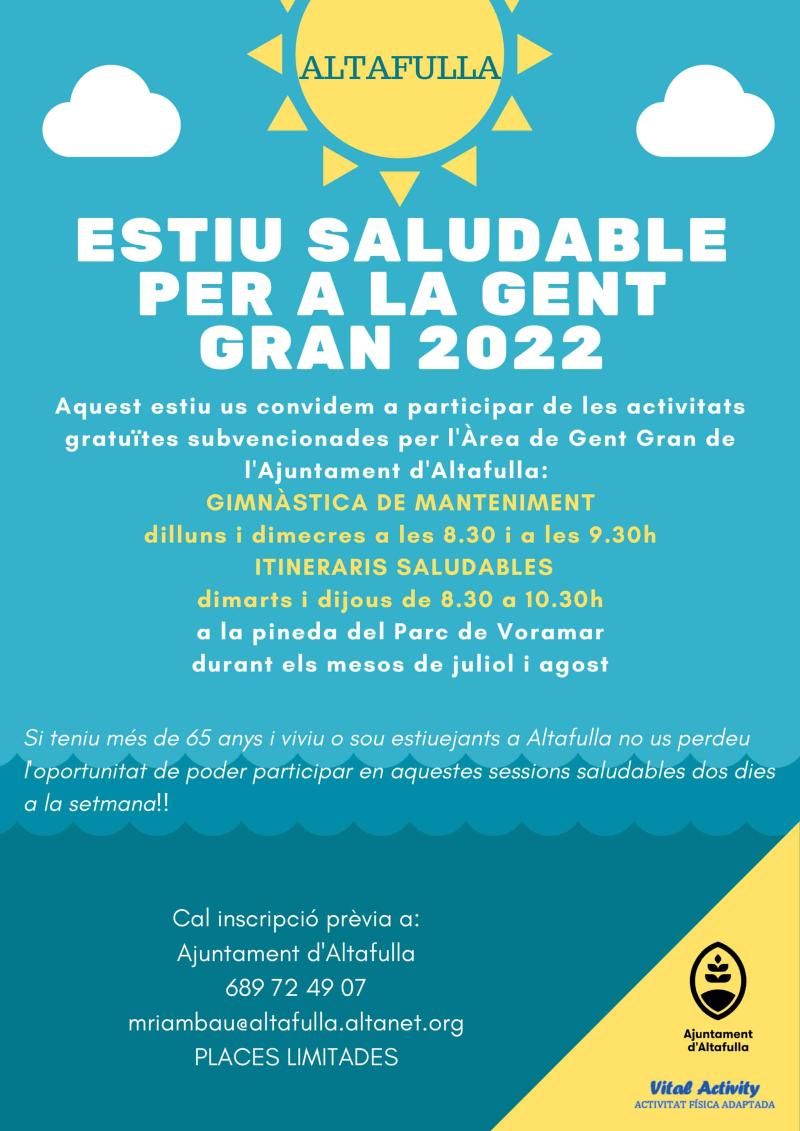 L'Àrea de Gent Gran de l'Ajuntament d'Altafulla torna a programar aquest estiu un conjunt d'activitats adreçades a la gent gran del municipi que promouen l'envelliment actiu.Enguany, proposen activitats de gimnàstica de manteniment i itineraris saludables, que es duran a terme a la pineda del Parc de Voramar durant els mesos de juliol i agost.L'Ajuntament convida a totes aquelles persones majors de 65 anys que visquin o estiguegin a Altafulla a realitzar aquestes sessions saludables que es realitzaran dos dies a la setmana. La gimnàstica de manteniment es farà els dilluns i els dimecres, a les 8:30 h i a les 9:30 h. Els itineraris saludables seran els dimarts i els dijous, de 8:30 h a 10:30 h.