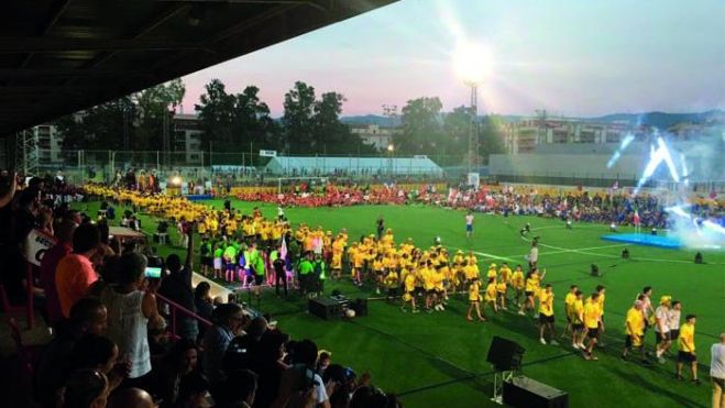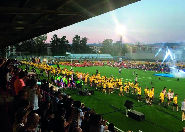 Una vegada a l’estadi han sigut els primers de desfilar pel davant de la graderia principal del camp de futbol, que ha quedat completament plena amb més prop de 1.500 espectadors. La última a desfilar ha sigut la delegació de Catalunya, la Catalunya Nord i Occitània, que ha sigut rebuda dempeus per bona part del públic.