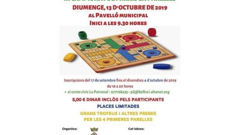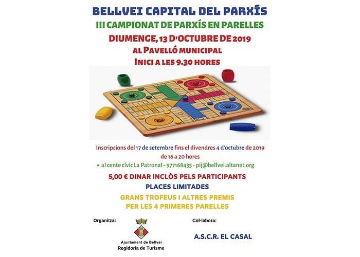 Bellvei s’ha convertit en la capital del Parxís i enguany tindrà lloc el tercer Campionat de parxís en parelles.Tindrà lloc el diumenge 13 d’octubre al pavelló municipal a partir de les 9.30 hores. El preu de les inscripcions és de 5 euros amb el dinar inclòs per a cada participant i es podran dur a terme fins al 4 d’octubre al Centre Cívic La Patronal, trucant al 977168435 o bé, enviant un e-mail a pij@ bellvei.altanet.org.Des de l’organització es recorda que les places són limitades.Hi haurà grans trofeus i altres premis per les quatre primeres parelles.Organitza la regidoria de turisme de l’Ajuntament de Bellvei i col·labora A.S.C.R. El Casal.