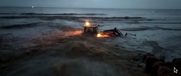 En el barranc de Barenys, de Salou, un tractorista estava treballant aquest matí per reforçar els marges de la desembocadura, a la platja de Ponent. El treballar no se n'ha donat compte de que el volum d'aigua anava pujant, fins al punt de trobar-se amb l'aigua fins a l'altura del coll.