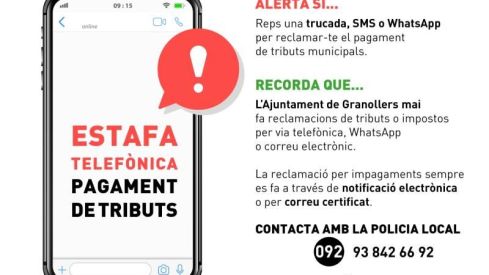 Si rebeu qualsevol trucada o missatge fraudulent, poseu-vos en contacte amb la Policia Local, trucant al telèfon 93 842 66 92.