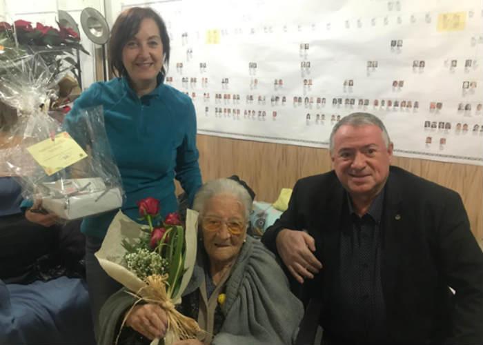 L´Alcalde de l’Arboç Joan Sans, acompanyat d’alguns regidors de l’Ajuntament, han volgut retre un petit homenatge l’Amèlia Guardià Andreu en el seu cent vuitè aniversari. L’alcalde, que s´ha desplaçat fins al domicili, li ha fet entrega d’un ram de roses i d’un necesser amb productes de farmàcia.