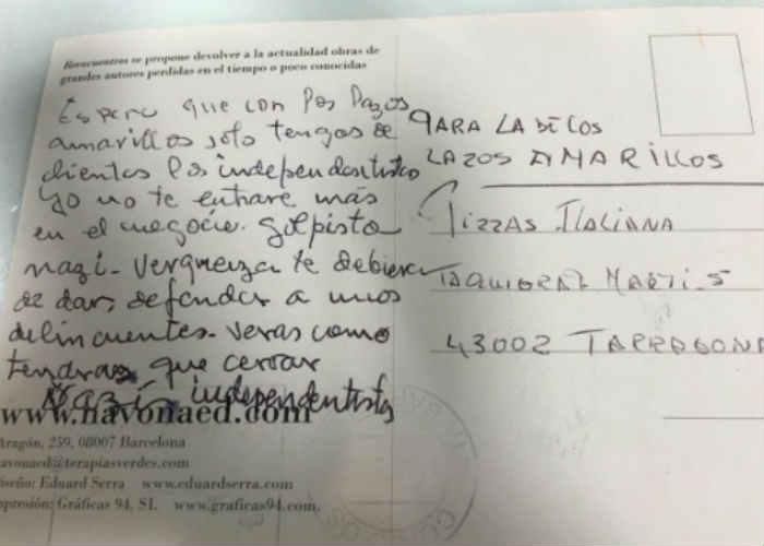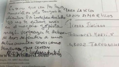 Els CDR Tarragona Eixample ha denunciat, aquest divendres a través del seu compte de twitter, la postal amenaçadora que han rebut les treballadores d'un establiment de restauració de la ciutat per portar llaços grocs. Segons el CDR Tarragona Eixample, les mateixes treballadores haurien rebut ja amenaces verbals amb anterioritat pel mateix motiu. Es tracta del restaurant Gli Italiani, situat al carrer Taquígraf Martí.L'autor de la postal titlla les treballadores de "colpistes nazis" i desitja que "amb els llaços grocs només tinguis clients independentistes". També retreu al personal que li hauria de fer vergonya "defensar a uns delinqüents". "Veuràs com hauràs de tancar nazi independentista", sentencia l'autor de la postal.