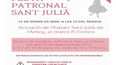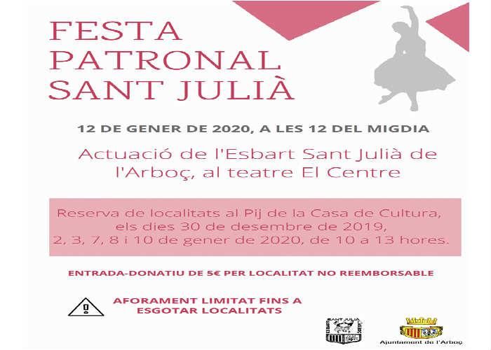 L’Arboç celebrarà la Festa Patronal de Sant Julià amb l’actuació de l’Esbart el proper diumenge 12 de gener a les 12 del migdia al Teatre El Centre de la vila. En aquesta ocasió, l’esbart ens deleitarà oferint un espectacle de danses tradicionals catalanes, algunes de contemporànies.