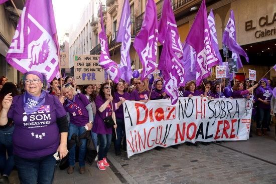 Més de 1.500 persones, majoritàriament dones, s'han sumat a la crida dels sindicats CCOO, UGT i la Plataforma Feminista i han tenyit de lila el centre de Girona aquest 8-M. La manifestació ha reclamat avançar cap a la igualtat, abolir la violència masclista i, sobretot, ha donat pes a les treballadores del supermercat Dia (afectades per un ERO). De fet, el lema que l'encapçalava era 'Al Dia no hi sobra ningú!! No a l'ERO!". La concentració ha començat a la carretera Barcelona i s'ha acabat a la plaça del Vi. Durant el recorregut, s'han cridat consignes com "Què és el que volem? Igualtat! I quan? Ja ja ja!", "Sense les dones no hi ha revolució" o "Sola i borratxa, vull arribar a casa!".