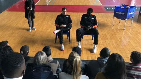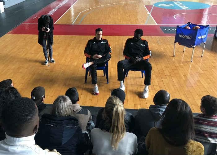 Miki Feliu i Ablaye Mbaye, els dos capitans del Força Lleida d’aquesta temporada 2018-2019, han estat aquesta setmana al Barris Nord amb una desena d’interns del Centre Penitenciari de Ponent i de Justícia Juvenil, tots ells usuaris del Programa Reincorpora, de l’Obra Social “laCaixa” i el Departament de Justícia. El motiu d’aquesta visita ha estat oferir als usuaris una primera sessió en forma de xerrada sobre Treball en Equip i quins valors s’han de tenir en compte per tal de rendir al màxim al lloc de treball.