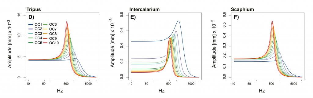 Marcé-Nogué i Liu van elaborar un model virtual tridimensional del conjunt d’ossicles del sistema basant-se en recerques prèvies i models anatòmics consolidats. Aquest model virtual ha estat sotmès a un escombrat de freqüències sonores en una simulació utilitzant el mètode dels elements finits, un mètode computacional que s’utilitza habitualment en enginyeria mecànica. És a dir, s’ha estudiat la vibració dels ossos en funció de la freqüència de la font sonora que se’ls aplica. Aquestes vibracions es transmeten als cossos i els fan vibrar més o menys, segons el material del qual estan fets i la seva estructura. Aquesta anàlisi va determinar que la freqüència de ressonància dels ossicles, és a dir, la freqüència a la qual els ossos vibren amb més intensitat, coincideix amb l’espectre audible d’aquests animals. Paral·lelament, van generar deu models modificant la mida dels ossicles i van repetir el mètode experimental. Els resultats apunten que la freqüència de ressonància no varia en funció de la mida dels ossicles sinó que dependria d’altres factors de la seva naturalesa.