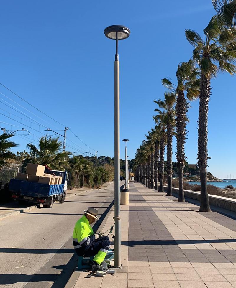 Aquesta setmana l’Ajuntament ha iniciat la renovació de l’enllumenat públic del Passeig Marítim de la Platja Llarga. Concretament, se substituiran les 78 lluminàries existents de vapor de sodi i halogenurs metàl·lics i s’instal·laran 10 nous punts de llum per acabar d’enllumenar zones concretes del passeig que ara quedaven més fosques.