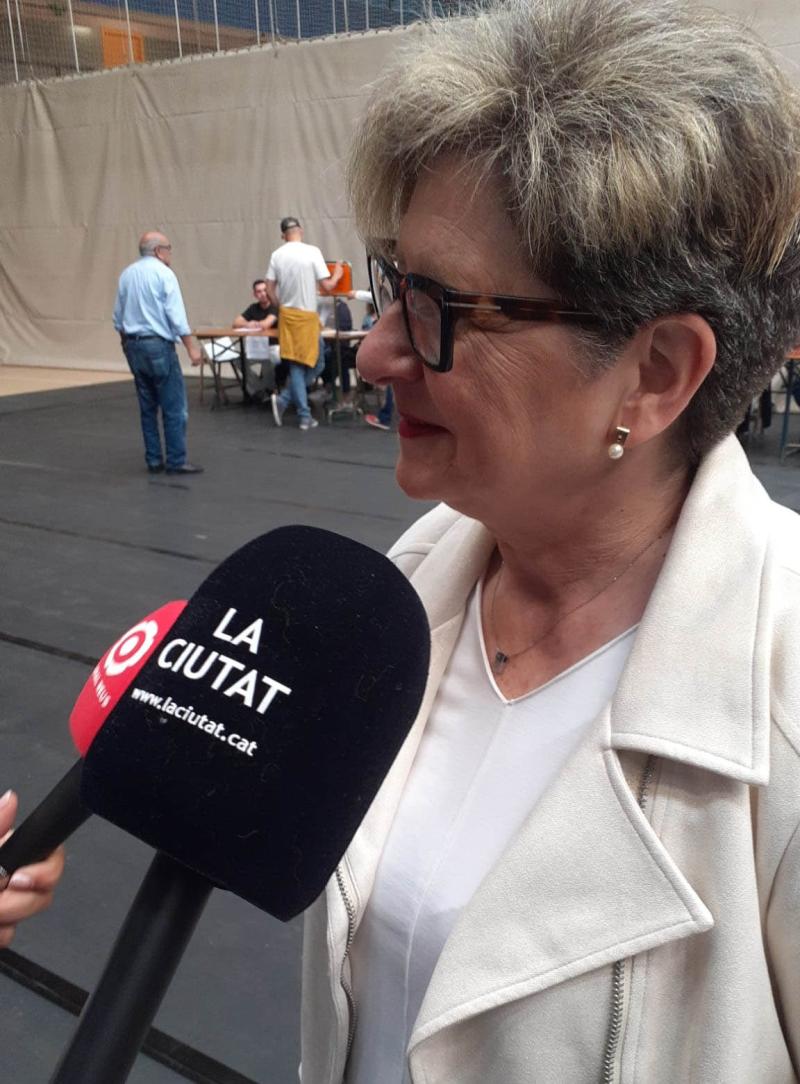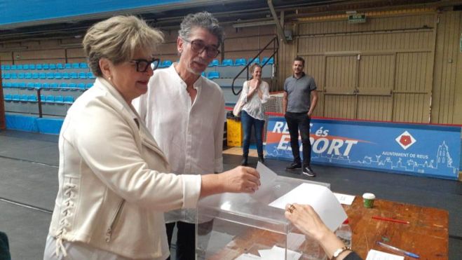 Acompanyada del seu marit i de la regidora Montserrat Caelles, Teresa Pallarès, la cap de llista de Junts a l'Ajuntament de Reus ha votat puntual al Pavelló Olímpic de Reus.