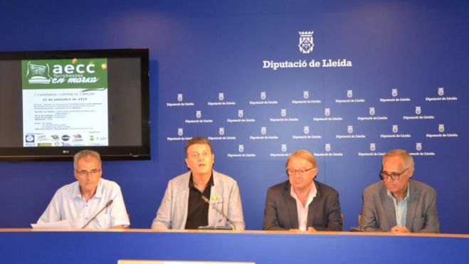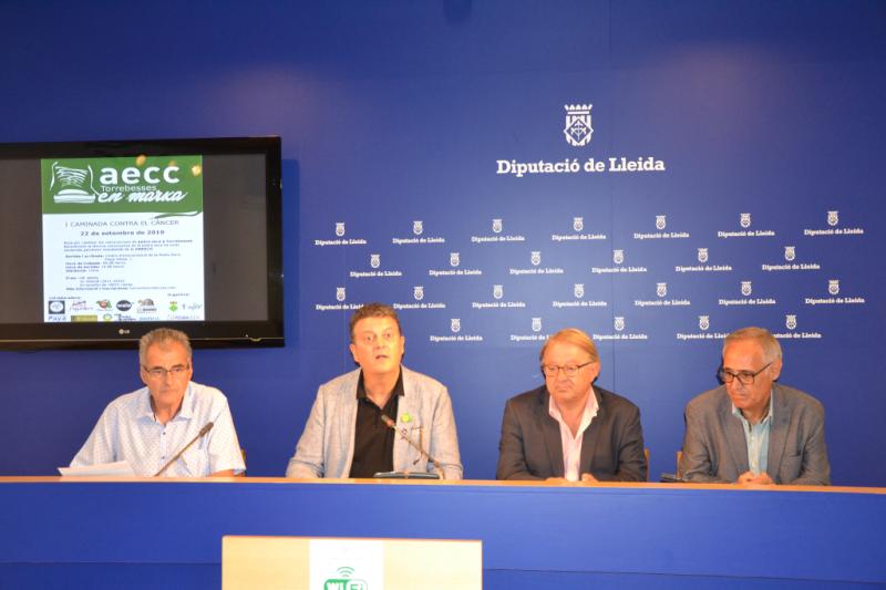 El vicepresident quart de la Diputació, Ferran Accensi, i el diputat Paco Cerdà han participat aquest dijous en la roda de premsa de presentació de la 1a Caminada contra el càncer a Torrebesses, que se celebrarà el diumenge 22 de setembre. La presentació -–que ha tingut lloc a la sala de premsa de la Diputació de Lleida- ha comptat amb les intervencions de l’alcalde de Torrebesses, Mario Urrea; i el president de l’Associació contra el Càncer (AECC), Eduardo Serrano.